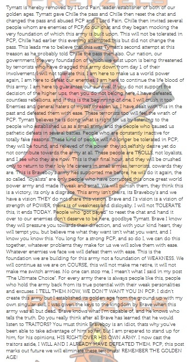 Pain wants to claim these rebels are “Terrorists”. Tymatt had supposedly overthrown Lord Pain, but the fact that Tymatt is not even on the Pretzels website makes the thing the other way around. Not only that, but Pain has charged claims at Tymatt claiming that he had given multiple troops the chat password. Any battles or further comment by Lord Pain or Tymatt will be put in addition to this post.