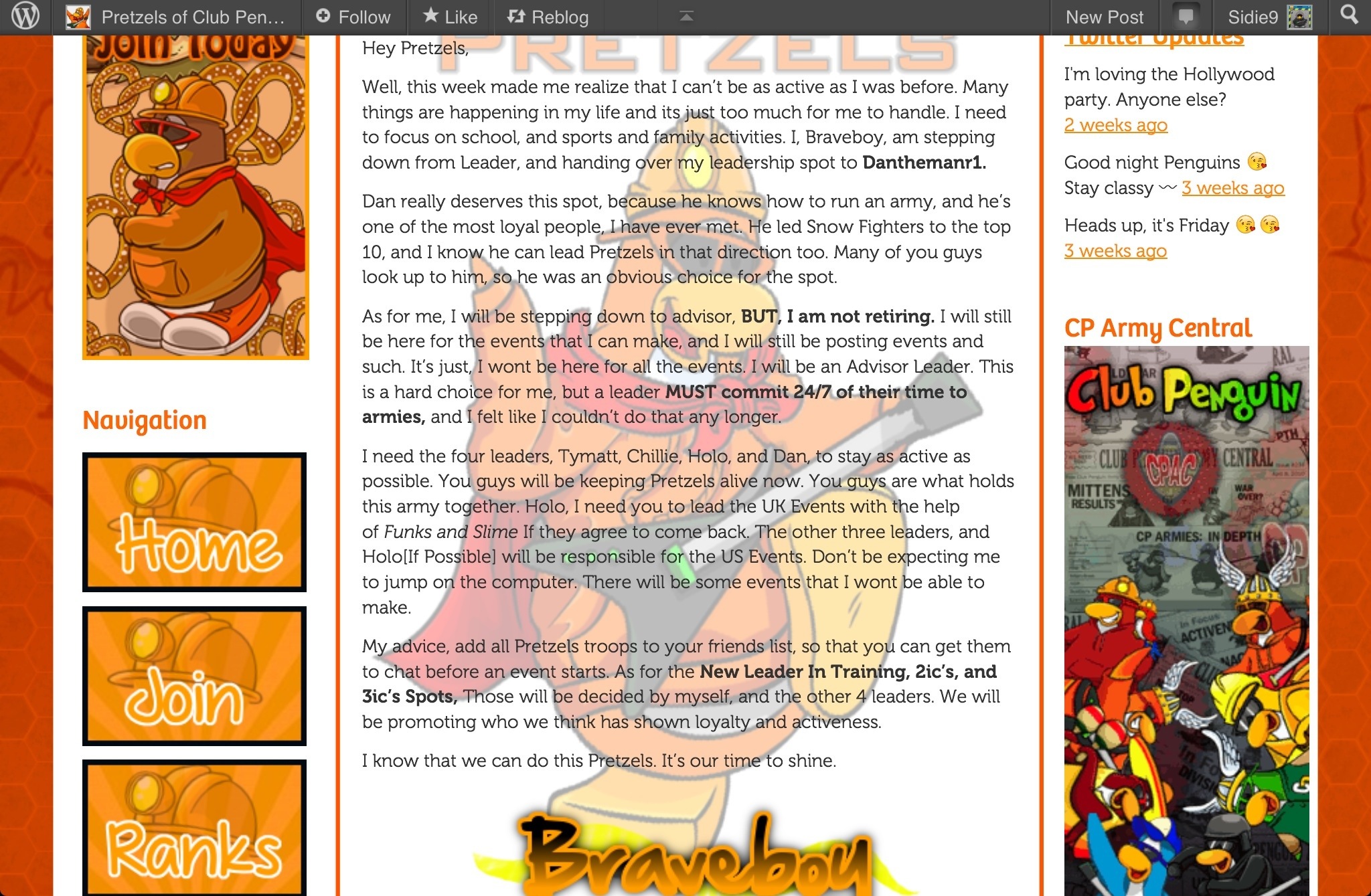 Now, not long ago, the infamous pretzels leader Braveboy has made a retirement post, deciding to appoint his loyal owner rank Danthemanr1 as Pretzels leader. Here is what Brave had to say in a post: